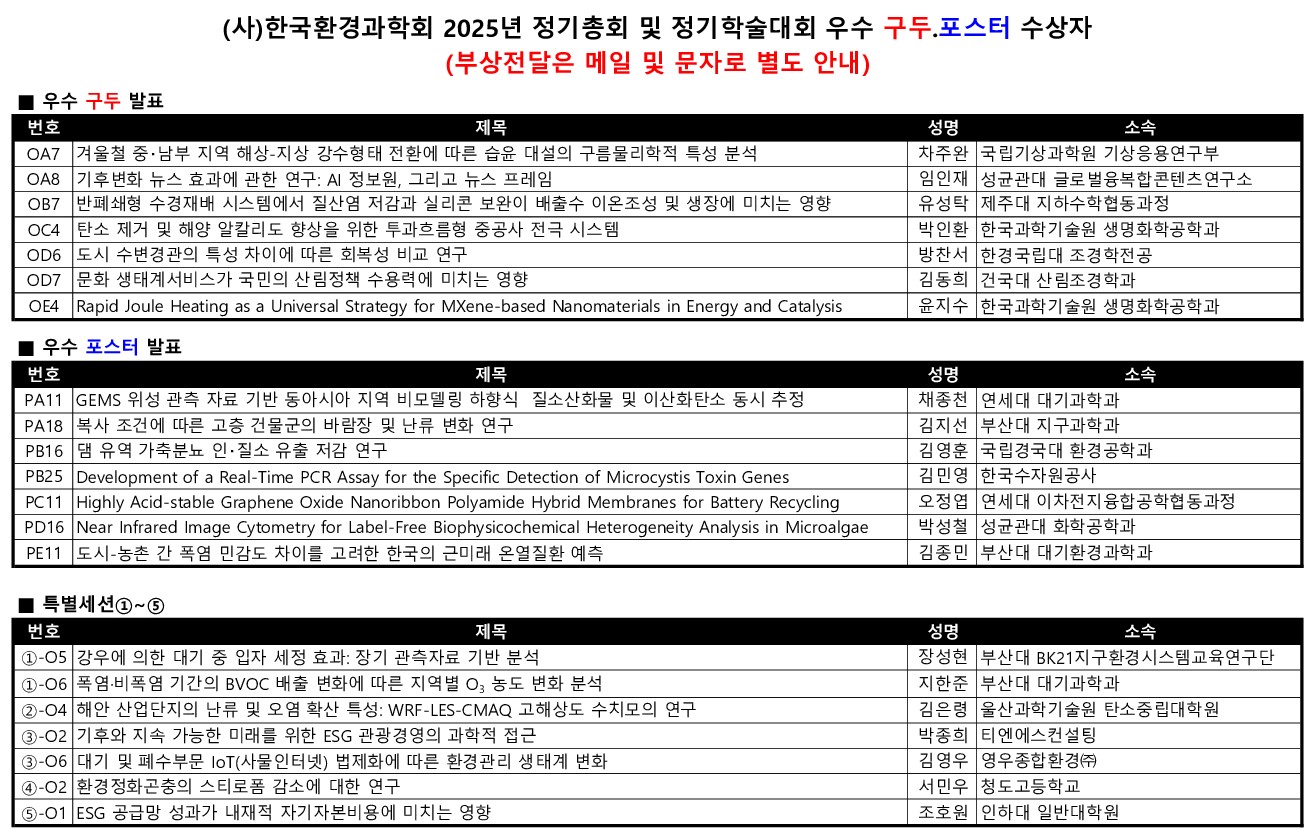 2025년 정기학술대회 우수구두,포스터 수상자 안내