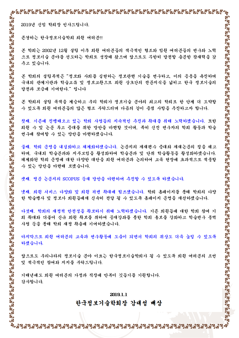 2019년도 신임 학회장 강대성 인사드립니다.