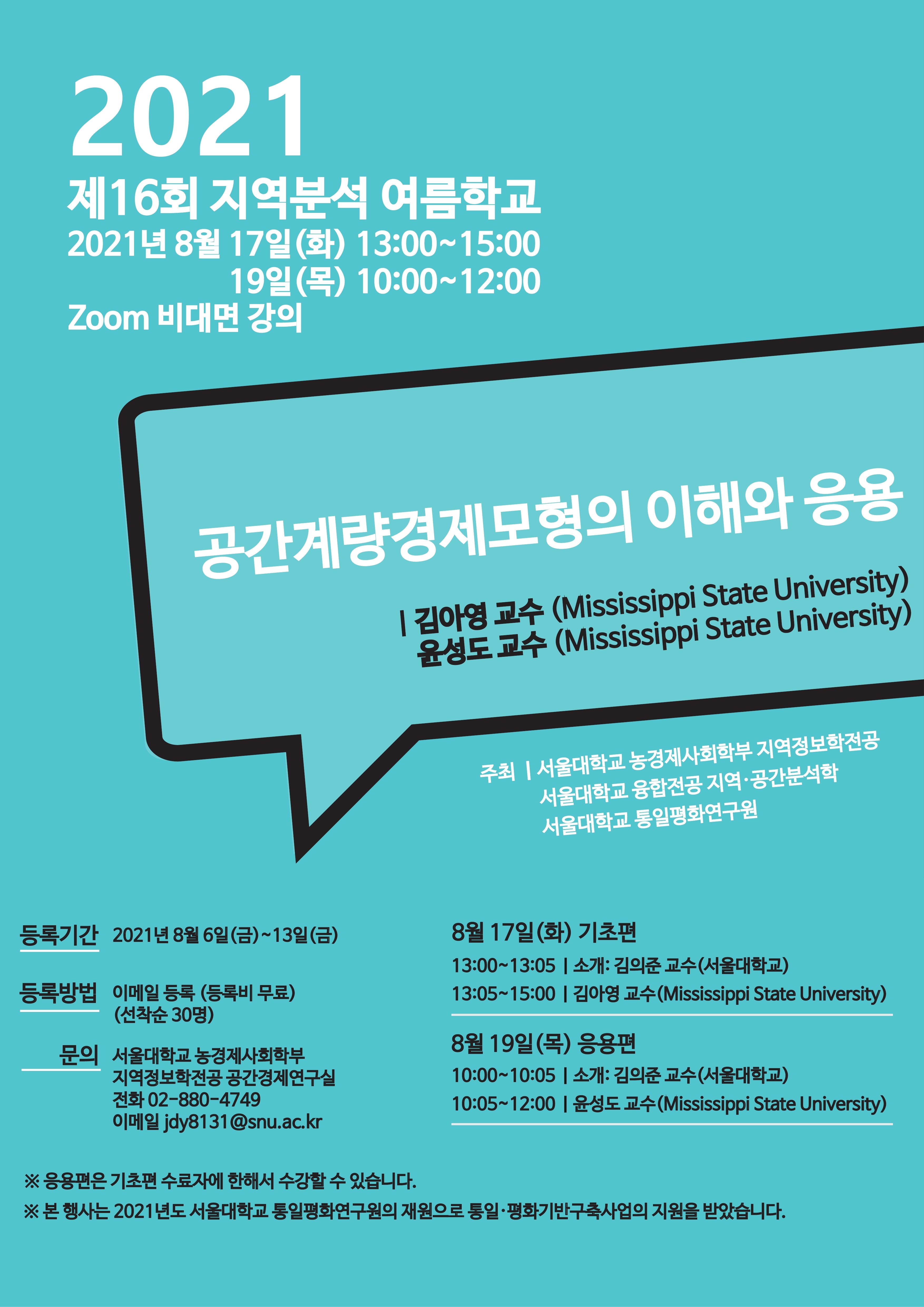 서울대학교 지역정보학전공(Regional Information Studies)과 융합전공 지역-공간분석학(Regional Studies and Spatial Analytics)에서 제16회 지역분석 여름학교를 개최합니다.