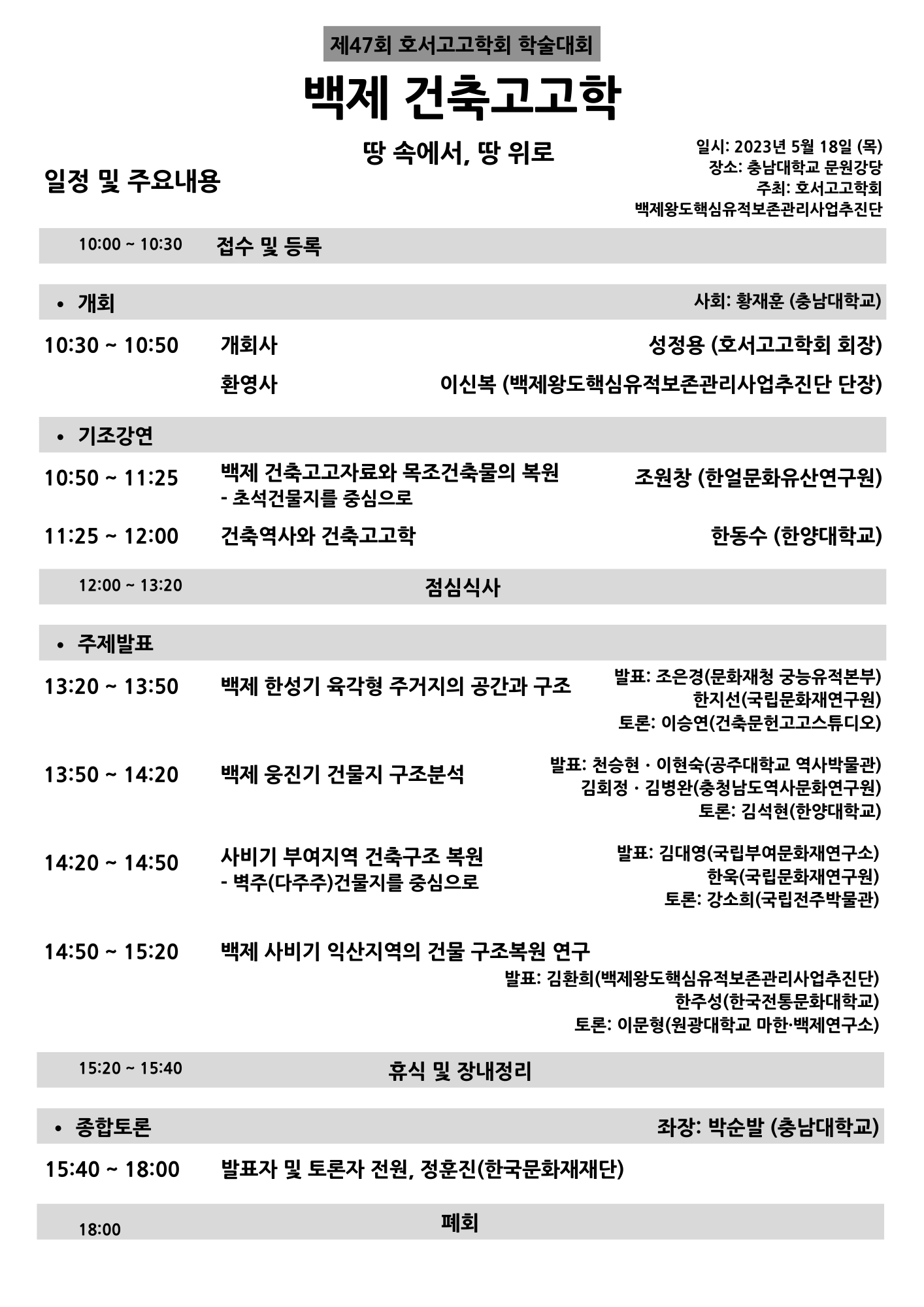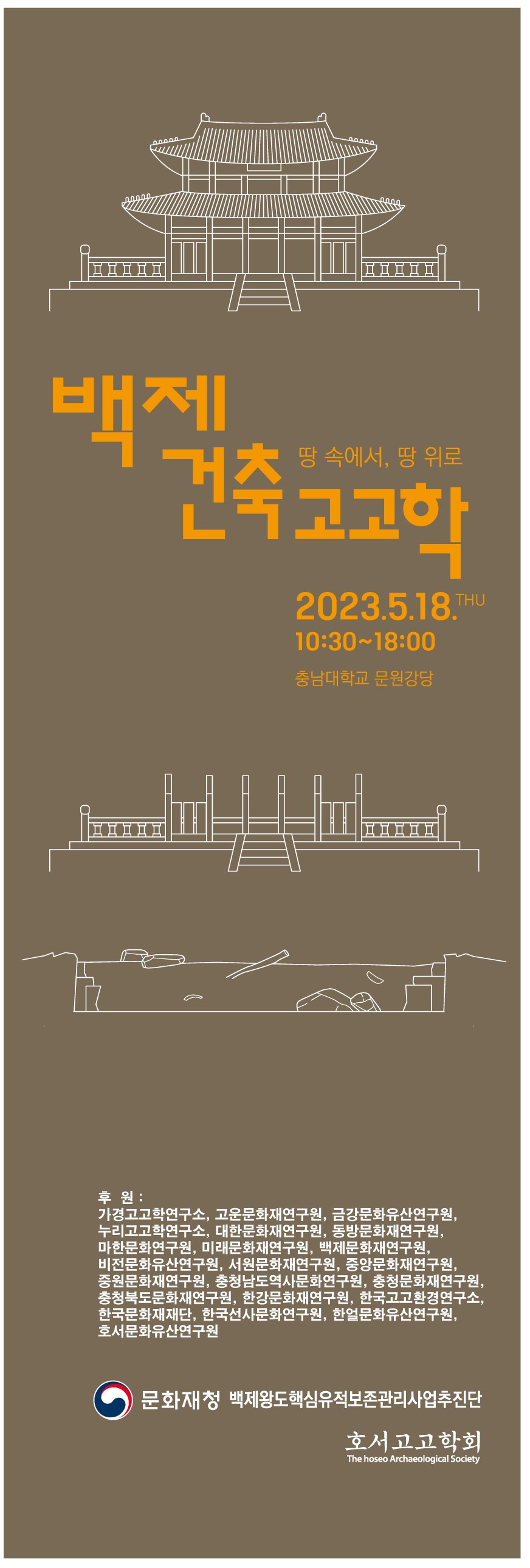 호서고고학회에서 백제왕도핵심유적보존관리사업추진단과 함께 2023년 5월 18일 '백제 건축고고학'을 주제로 학술대회를 개최합니다.