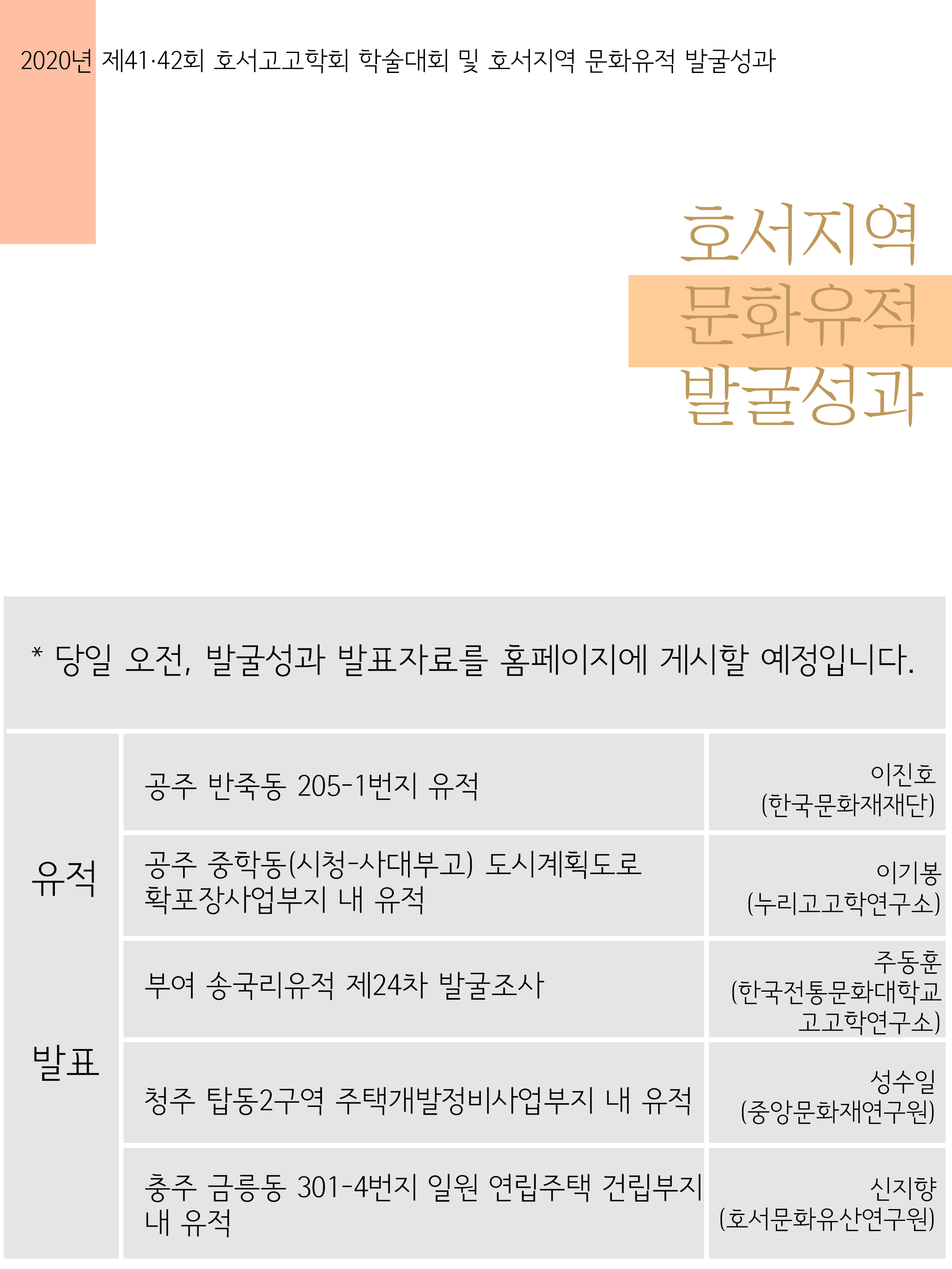 2020년도 제 41·42회 호서고고학회 학술대회 및 호서지역 문화유적 발굴성과 사례 발표가 10월 23일 금요일에 진행됩니다.