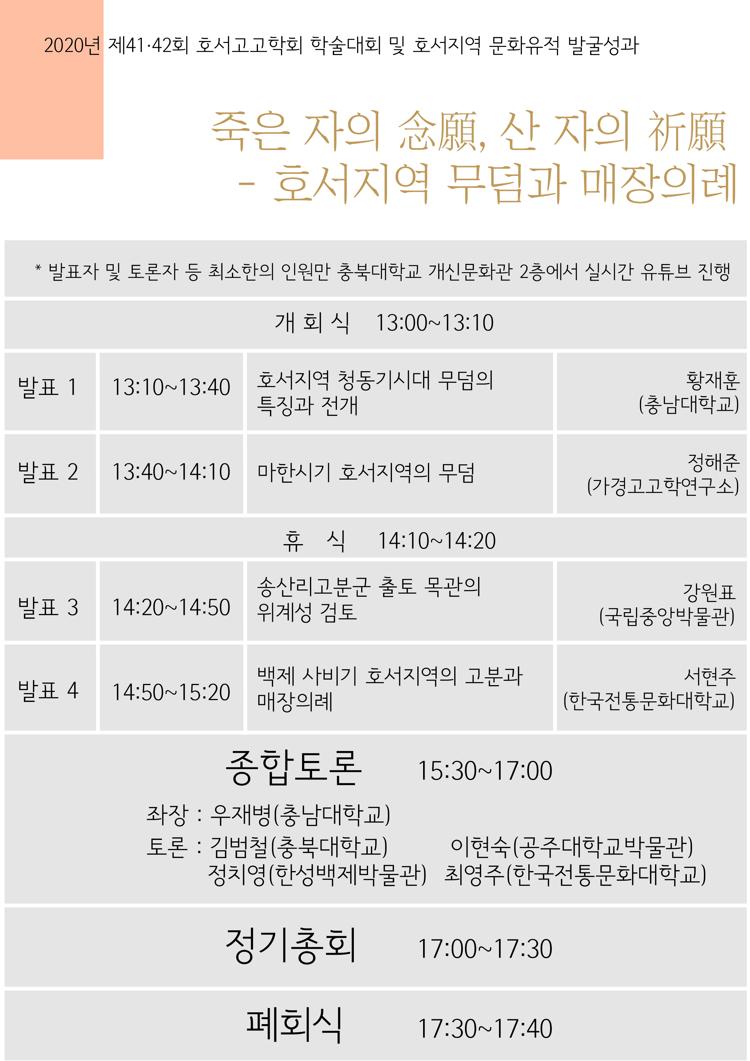 13시 이후부터 진행되는 학술 논문 발표는 충북대학교박물관 공식 유튜브계정에서 실시간으로 진행됩니다.