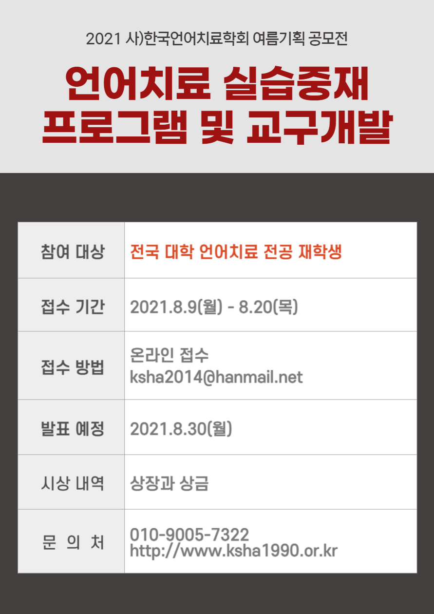 언어치료학문을 널리 알리고 예비 언어치료사들의 역량 개발을 위하여 언어치료 실습프로그램 및 교구개발 공모전을 개최합니다.