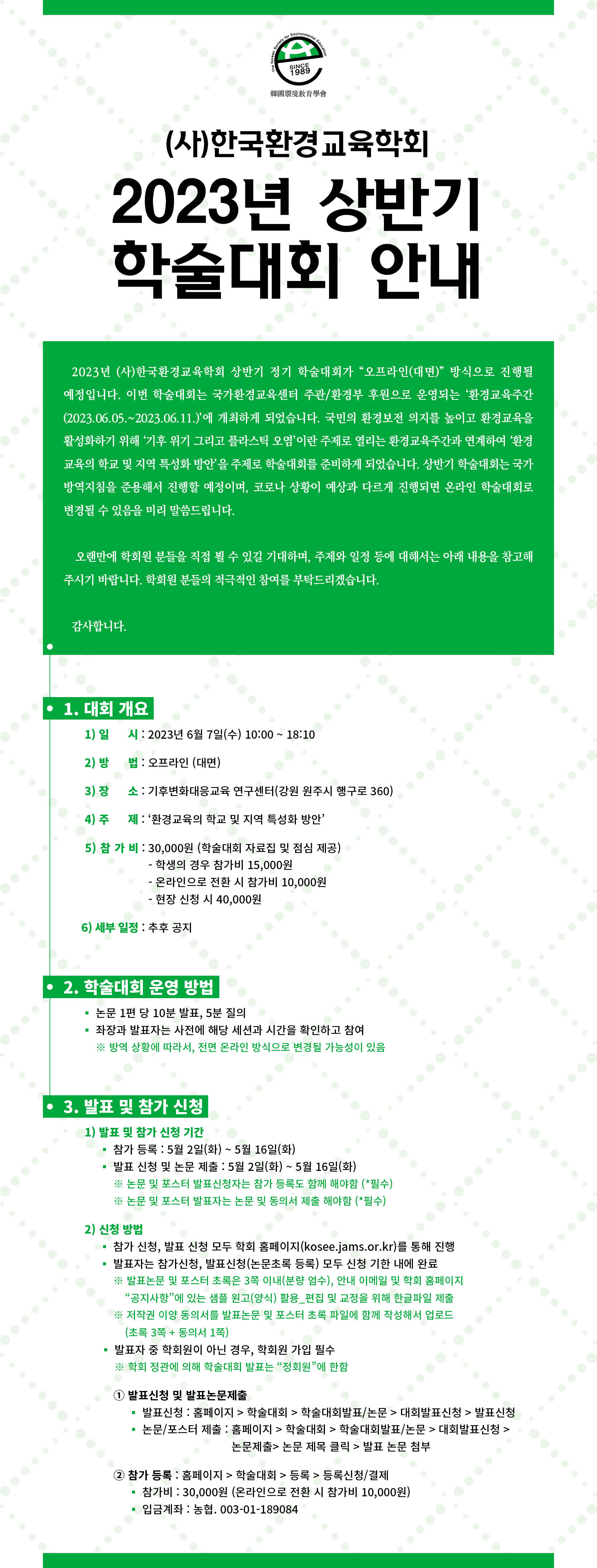2023년 (사)한국환경교육학회 상반기 정기 학술대회가 “오프라인(대면)” 방식으로 진행될 예정입니다.
