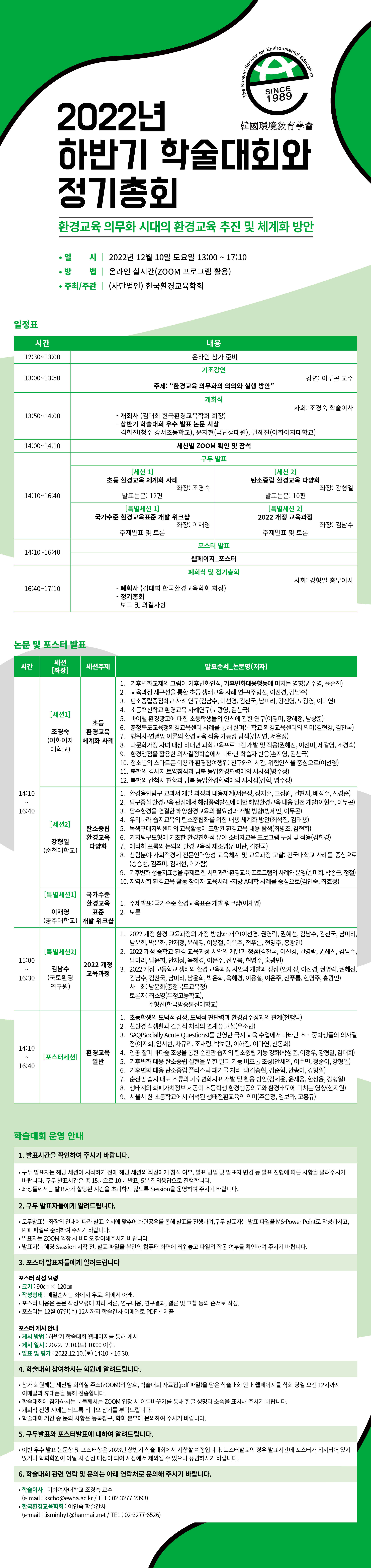 2022년 (사)한국환경교육학회 하반기 정기 학술 대회와 정기 총회가 “온라인(비대면)” 방식으로 진행될 예정입니다.