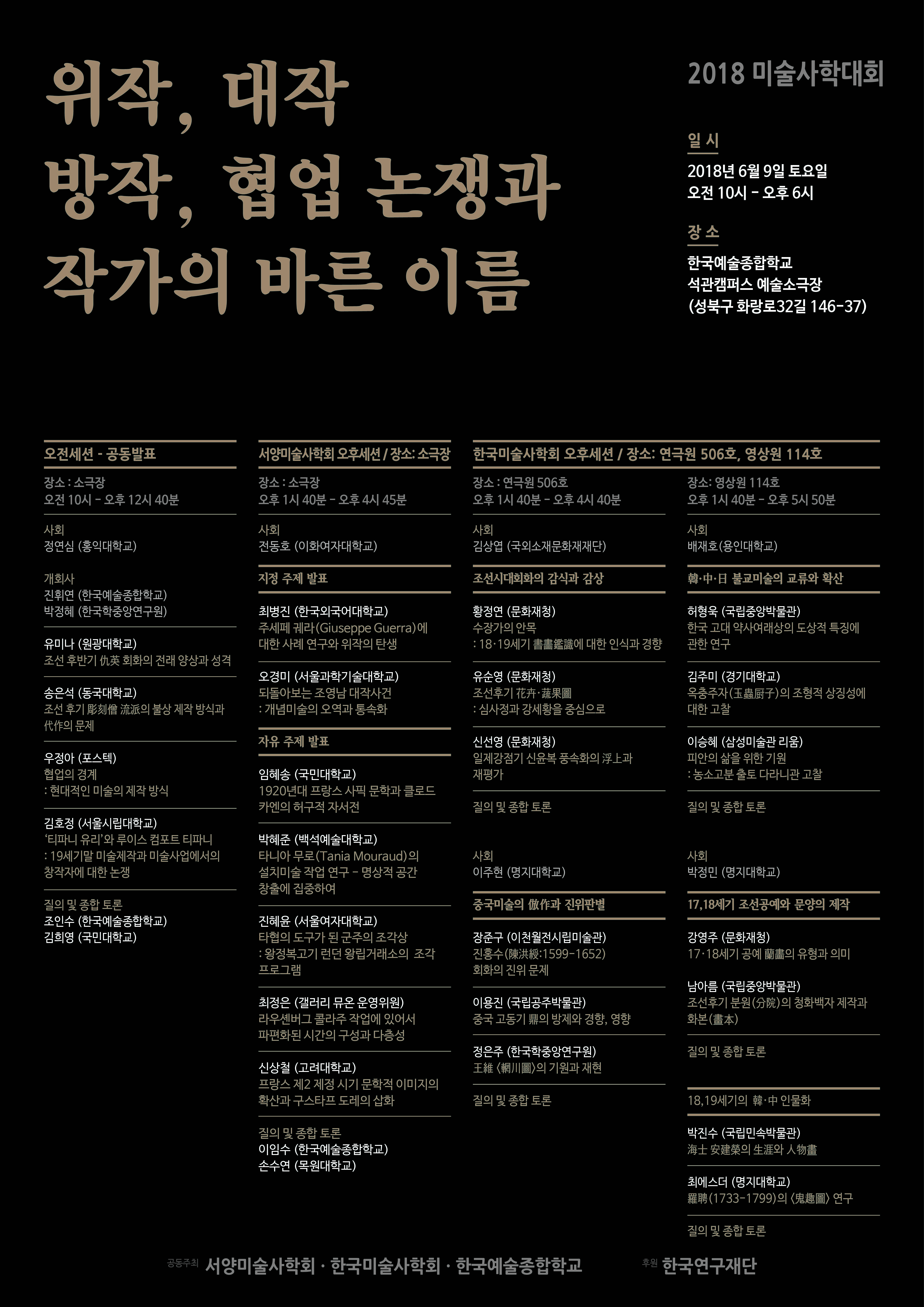 ㅇ 내용 : 작가와 작품의 관계가 분리될 수 없는 현실에서 작가의 변화한 모습과 위작, 또는 모작의 상황에 대한 제도적 문제제기가 필요합니다. 2018년 미술사학대회에서는 한국 및 서양미술사학 연구자들이 모여 작가의 이름을 둘러싼 새로운 연구결과를 논의하고 위작, 대작, 방작, 협업 등 현상을 분석하여 역사적 평가를 새롭게 만드는 토론의 장을 마련하려고합니다.