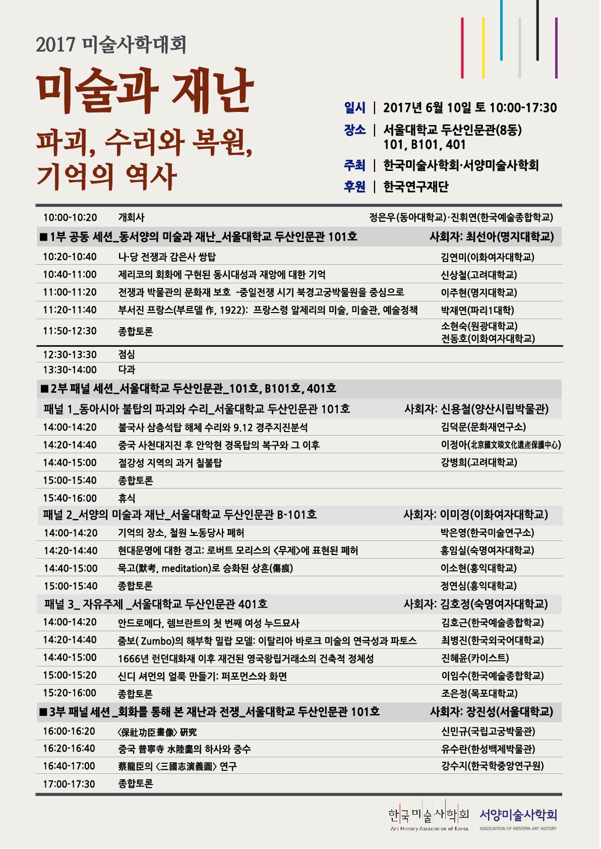2017년 미술사학대회 및 서양미술사학회 춘계 학술대회가 6월 10일 서울대학교에서 개최됩니다. 학회원 및 서양미술사에 관심있는 여러분의 많은 관심과 참여 바랍니다.