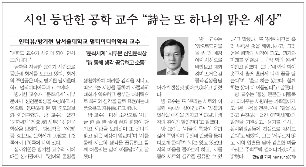 방기천 전임회장님(남서울대학교 교수님) 중도일보 인터뷰 기사