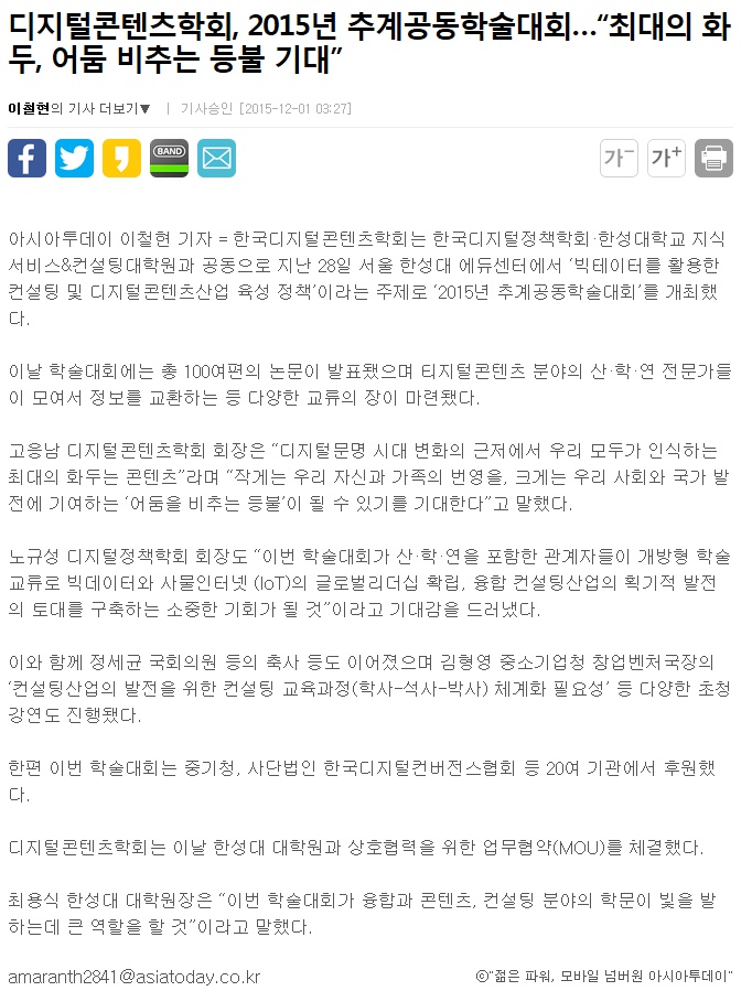 2015년도 추계공동학술대회 기사가 12월 1일자 아시아투데이에 실렸습니다.