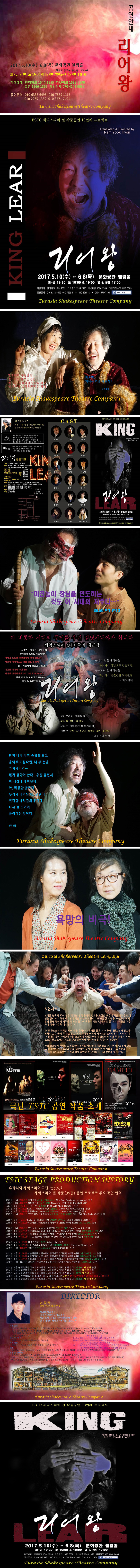 어느새 새 봄이 꽃들과 함께 무르익고 있습니다. 창단 공연부터 연속해서 10년 이상 국내초연작 공연들만 15편 정도를 공연해왔던 우리 극단 ESTC가 2017년 5월 10일 수요일부터 6월 8일 목요일까지 4주간 셰익스피어의 빼어난 수작 <리어왕>을 극단 창단 15주년을 기념하여 새번역 공연으로 대학로(동숭동 195-6번지) 문화공간 엘림홀에서 올리게 되었습니다. 우리 극단 STC가 2002년부터 계속 추진하고 있는 셰익스피어 전작품(39편) 공연 프로젝트의 18번째의 작품이며 공연 극장 엘림홀은 약 230석의 연극무대로 대학로(동숭동) 한복판에 위치하고 있어 접근성이 아주 좋은 공연 공간입니다.