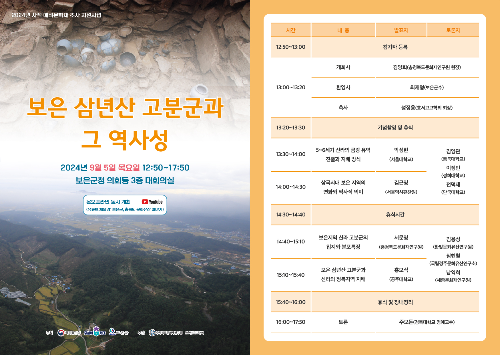 호서고고학회와 충청북도문화재연구원에서 공동주관하는 "보은 삼년산 고분군과 그 역사성"학술대회가 9월 5일 보은군청 의회동 3층 대회의실에서 개최됩니다.