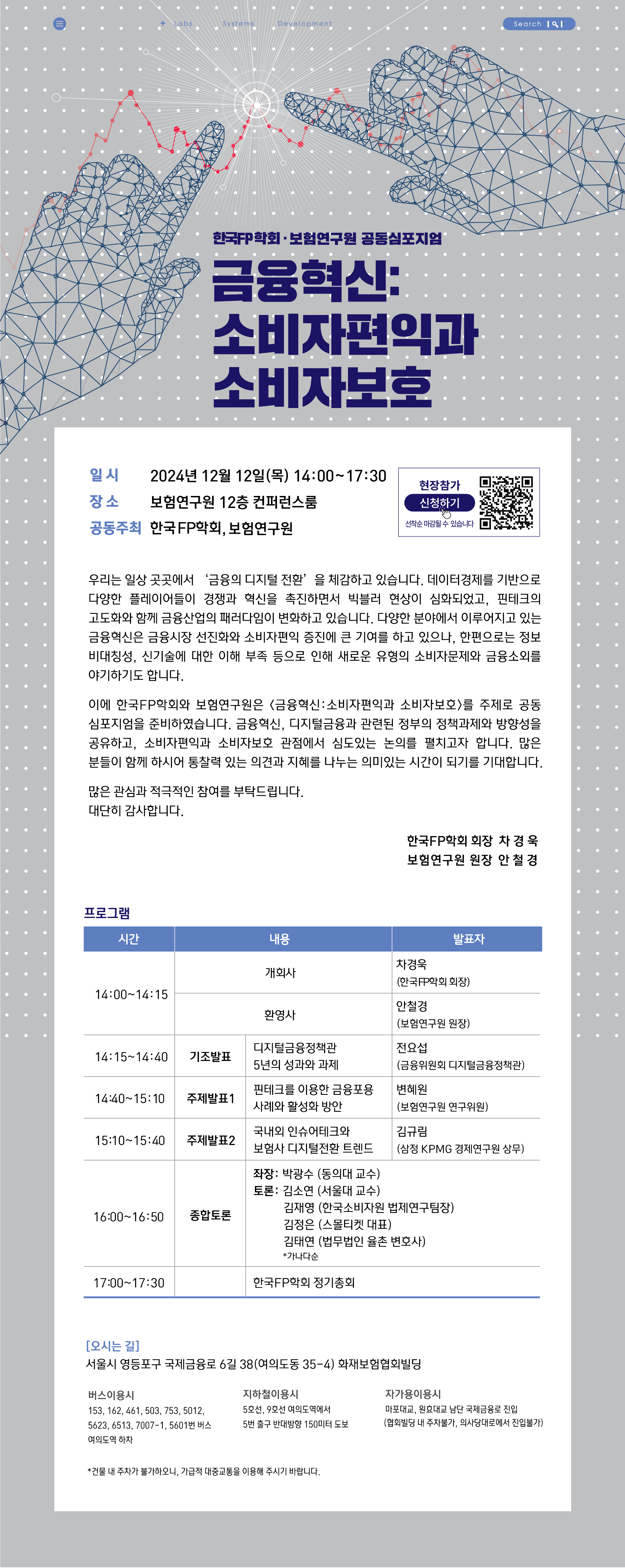 한국FP학회는 오는 12월 12일(목) <금융혁신:소비자편익과 소비자보호>를 주제로, 보험연구원과 공동심포지엄을 개최합니다.
