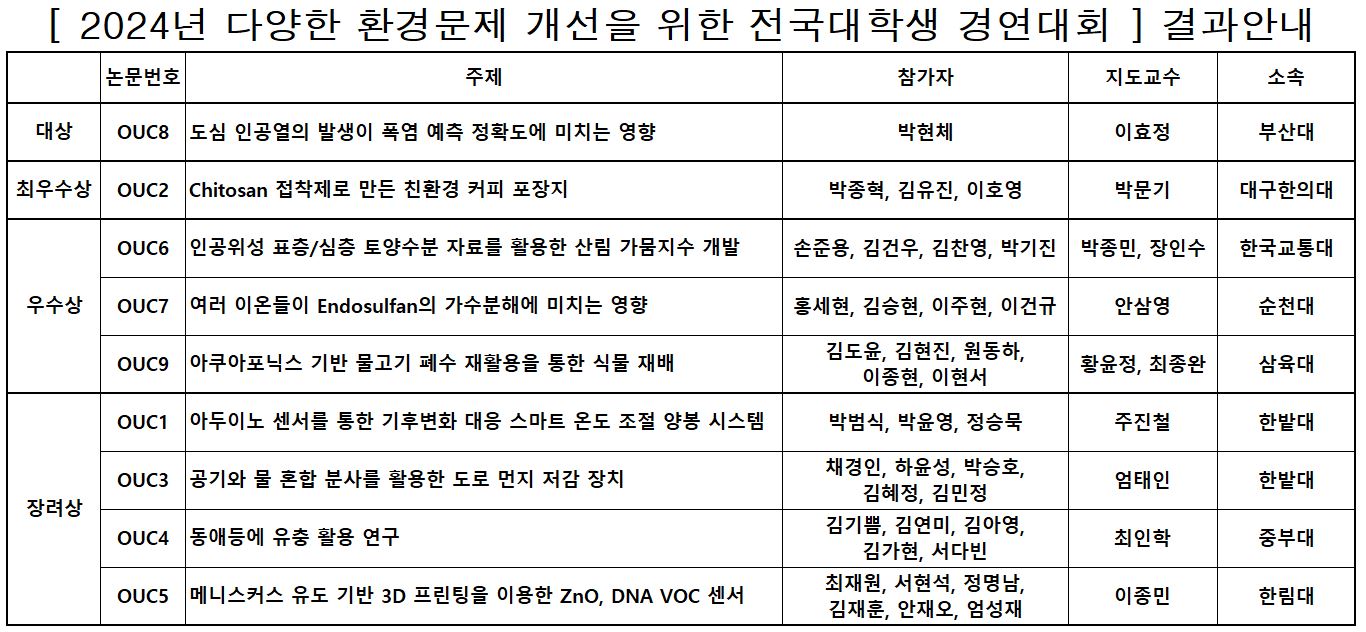 024년 11월 28일 ~ 11월 30일, 본 학회 2024년 정기학술대회에서 개최된2024년 다양한 환경문제 개선을 위한 전국 대학생 경연대회결과를 아래와 같이 안내드립니다.(상장 및 부상 신청에 관하여는 대표학생 및 지도교수님 메일로 발송완료)