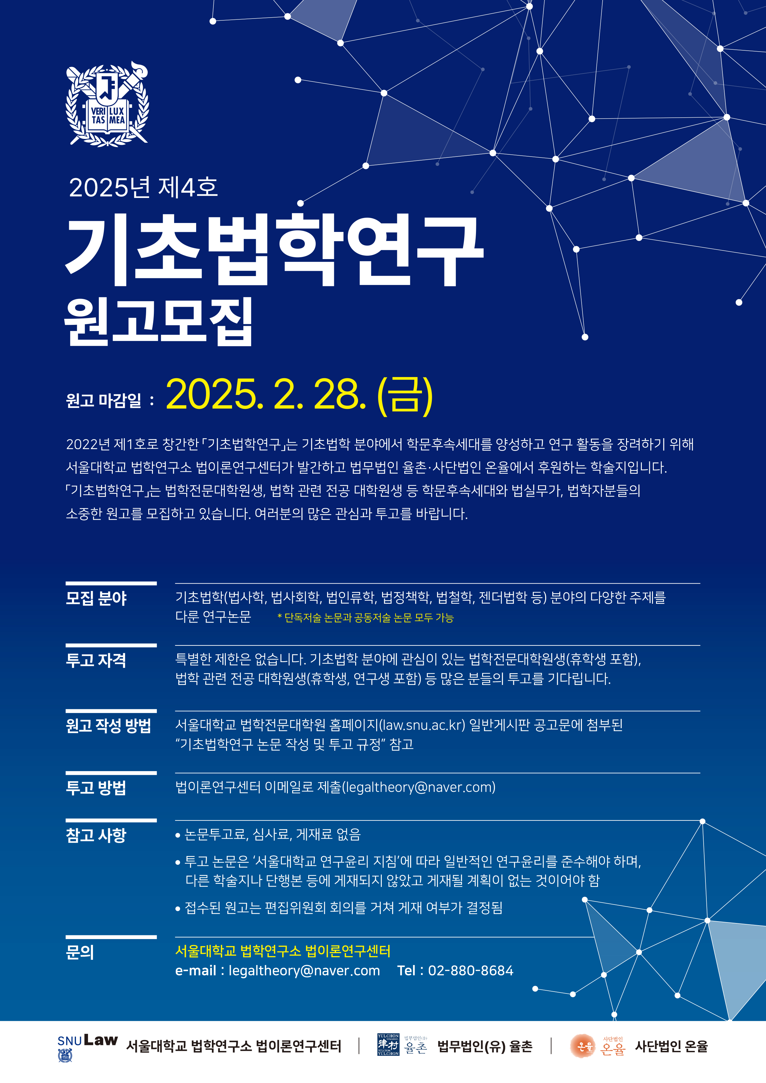 2022년 제1호로 창간한 『기초법학연구』는 기초법학 분야에서 학문후속세대를 양성하고 연구 활동을 장려하기 위해 서울대학교 법학연구소 법이론연구센터가 발간하고 법무법인 율촌·사단법인 온율에서 후원하는 학술지입니다. 『기초법학연구』는 법학전문대학원생, 법학 관련 전공 대학원생 등 학문후속세대와 법실무가, 법학자분들의 소중한 원고를 모집하고 있습니다. 여러분의 많은 관심과 투고를 바랍니다.