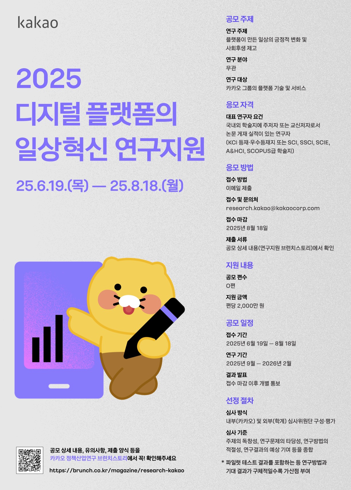 카카오에서는 최근 '디지털 플랫폼의 일상혁신'을 주제로 한 연구지원 사업을 새롭게 기획, 진행하고 있습니다.