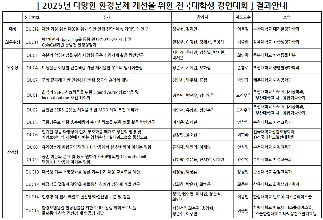 2025년 11/13(목) ~ 11/15(토), 본 학회 2025년 정기학술대회에서 개최된2025년 다양한 환경문제 개선을 위한 전국 대학생 경연대회를 아래와 같이 안내드립니다.
