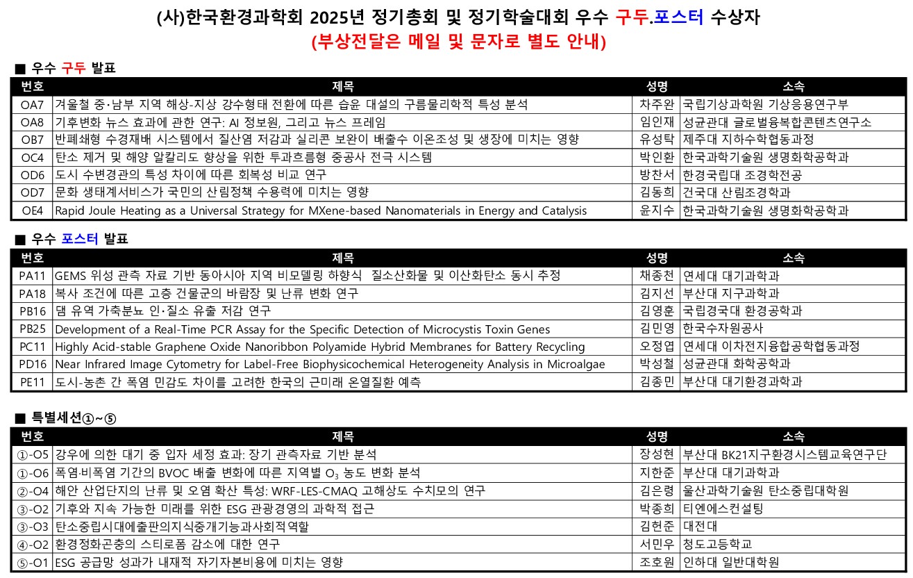 2025년 정기학술대회 우수구두,포스터 수상자 안내