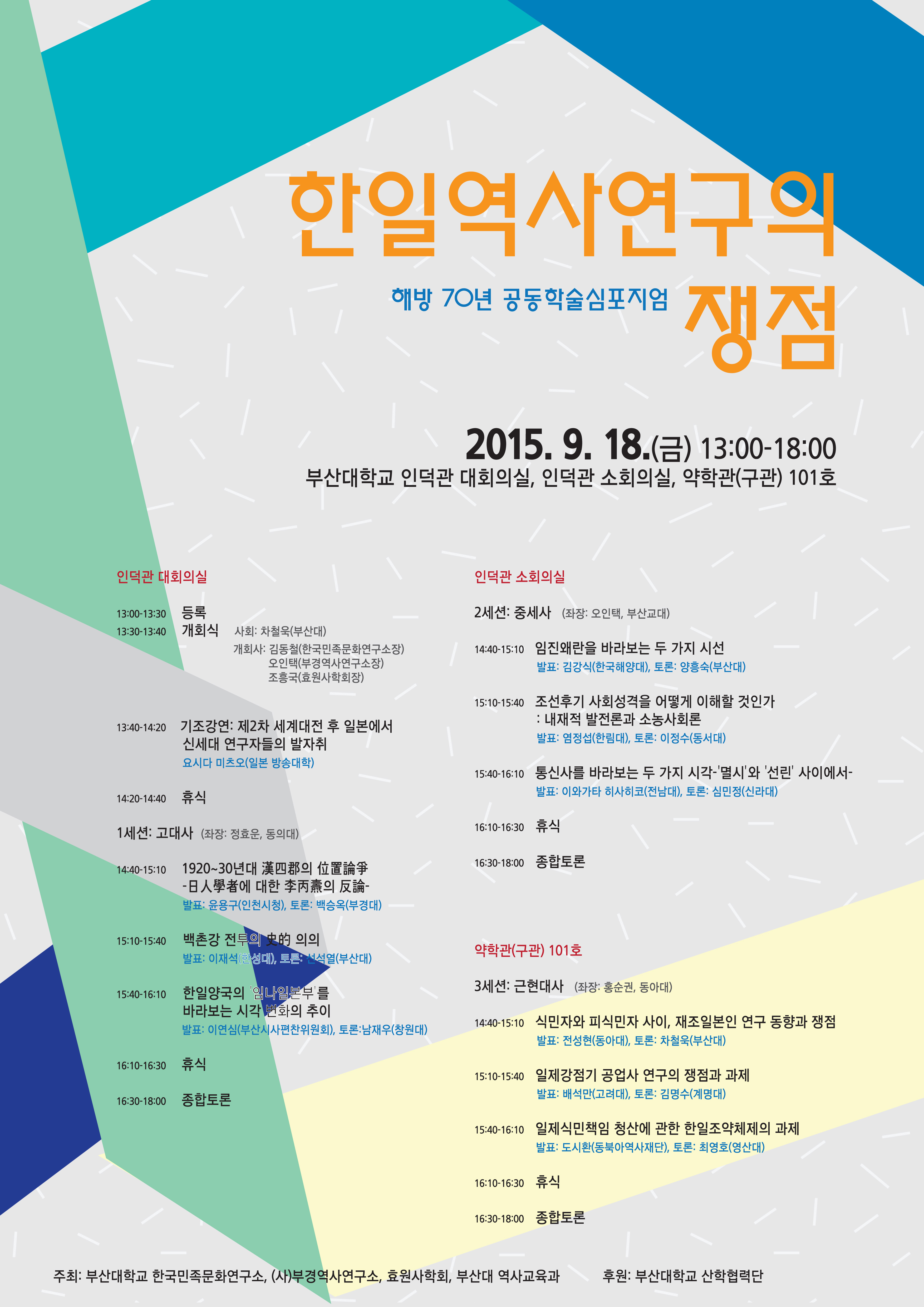 - 해방 70주년과 한일회담 50주년을 기념해, 역사학계에서 진행된 한일 연구의 쟁점을 주제로 한다.