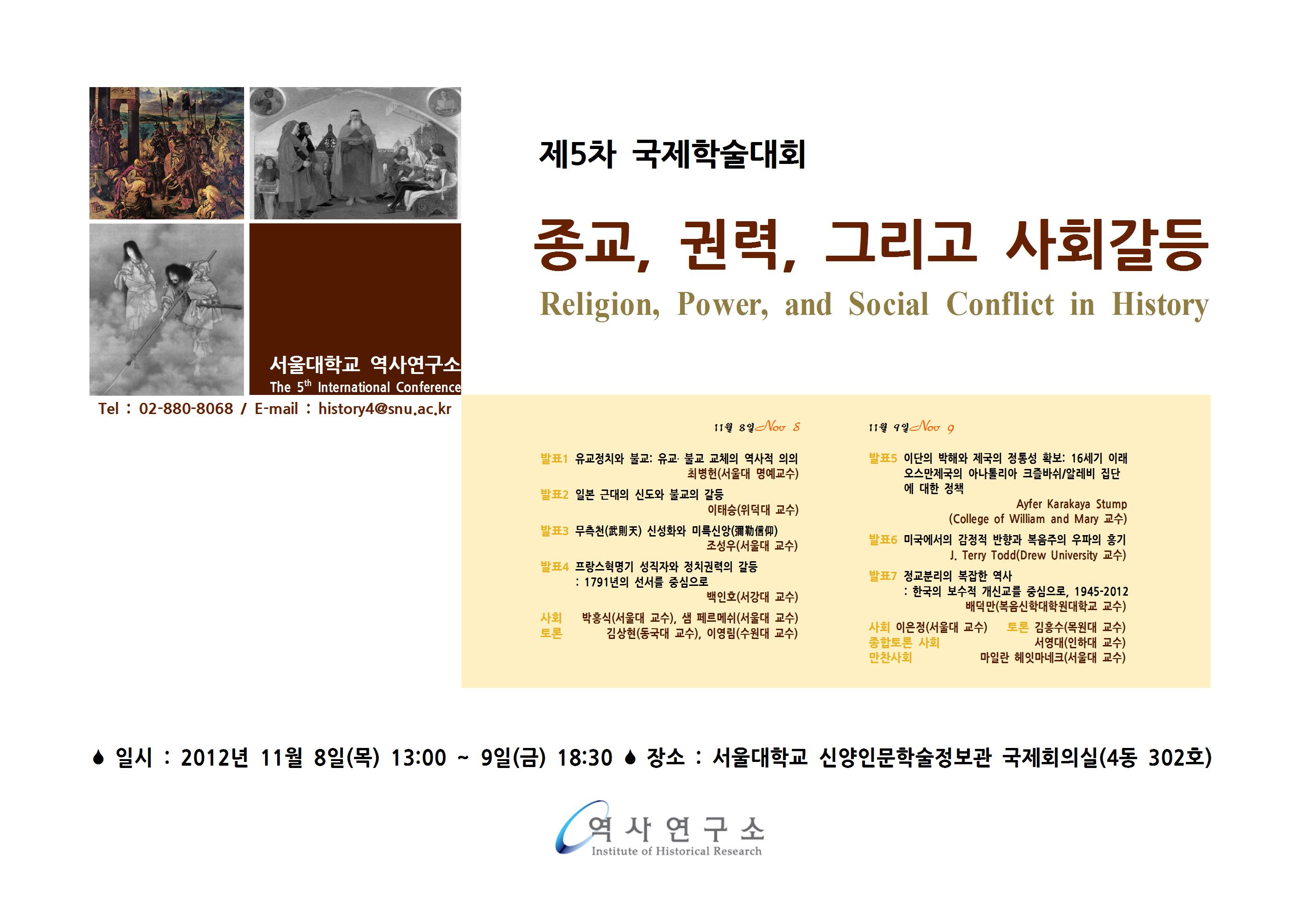 종교는 과거의 인류역사에서도, 첨단과학기술문화가 널리 퍼진 21세기 현재에도 세계나 국내의 정세에 큰 힘을 미치고 있습니다. 국내외의 문제되는 여러 사회갈등에는 종교가 연관되어 있기도 합니다. 이번에 개최되는 국제학술회의에서는 종교가 결부된 사회갈등의 측면 중에서도, 첨예한 갈등을 유발한, 권력과 얽힌 사회갈등에 대해 검토하려 합니다.