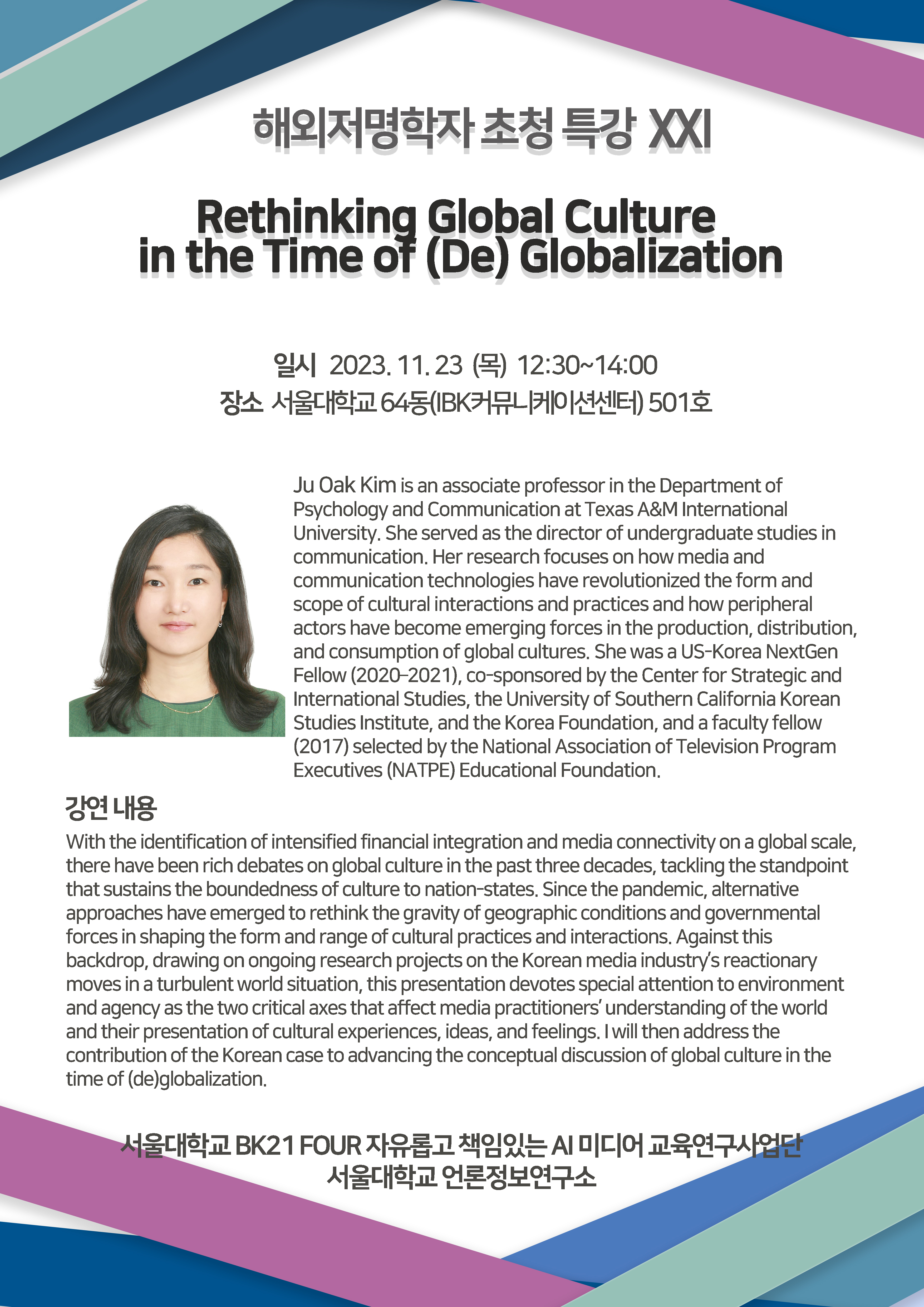 2. 서울대학교 언론정보학과 BK21 FOUR "자유롭고 책임있는 AI 미디어" 교육연구단과 언론정보연구소에서 <제21회 해외저명학자 초청 특강>을 다음과 같이 개최합니다. 회원님들의 많은 관심과 참여 바랍니다.