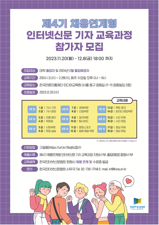 2. 한국인터넷신문협회에서 <제4기 채용연계형 인터넷신문 기자 교육과정> 참가자를 다음과 같이 모집합니다. 회원님들의 많은 관심과 참여 바랍니다.
